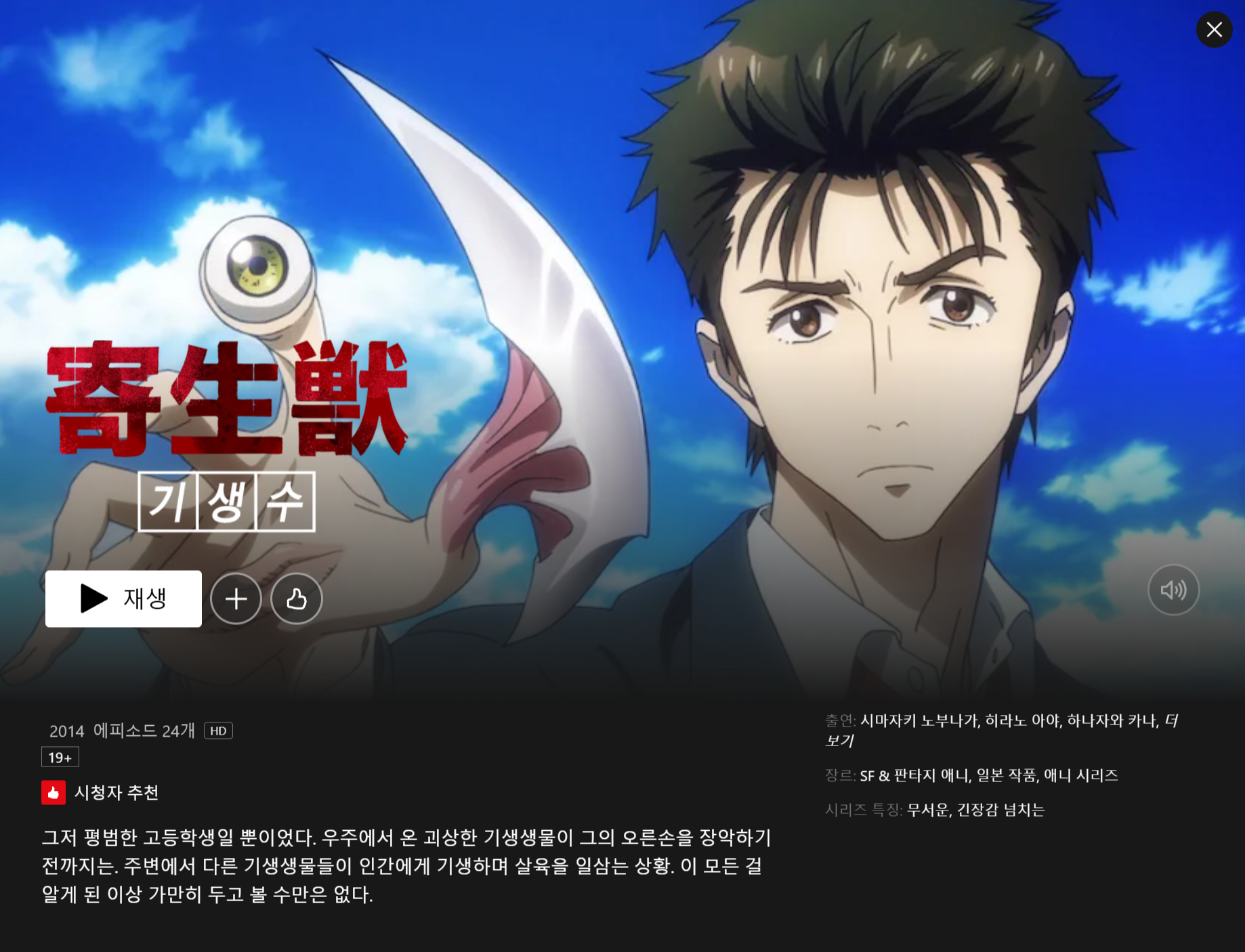줄거리: 기생 생명체에 의해 오른손이 변이된 고등학생의 생존기를 그린 작품입니다.