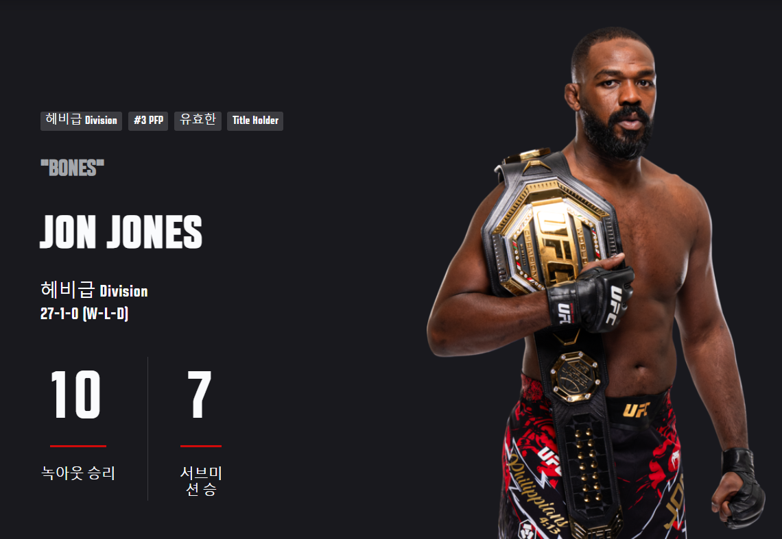 • 강점: UFC 최연소 챔피언 기록 보유 (23세) 뛰어난 리치(84.5인치)와 그래플링 기술 상대의 약점을 철저히 파고드는 전략적 플레이
